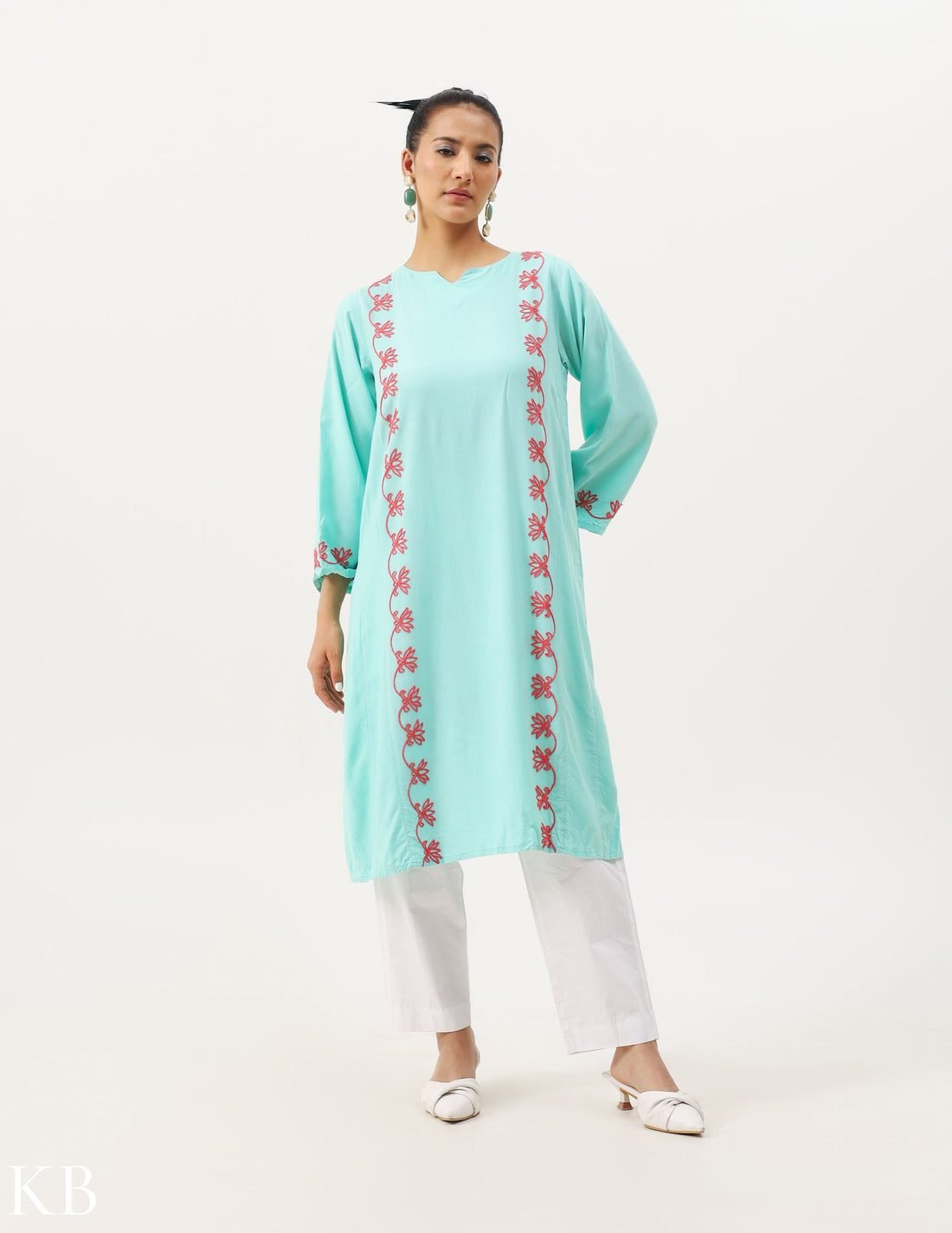 Pamposh Panelled Aari Embroidery Cyan-Green Rayon Kurti Set