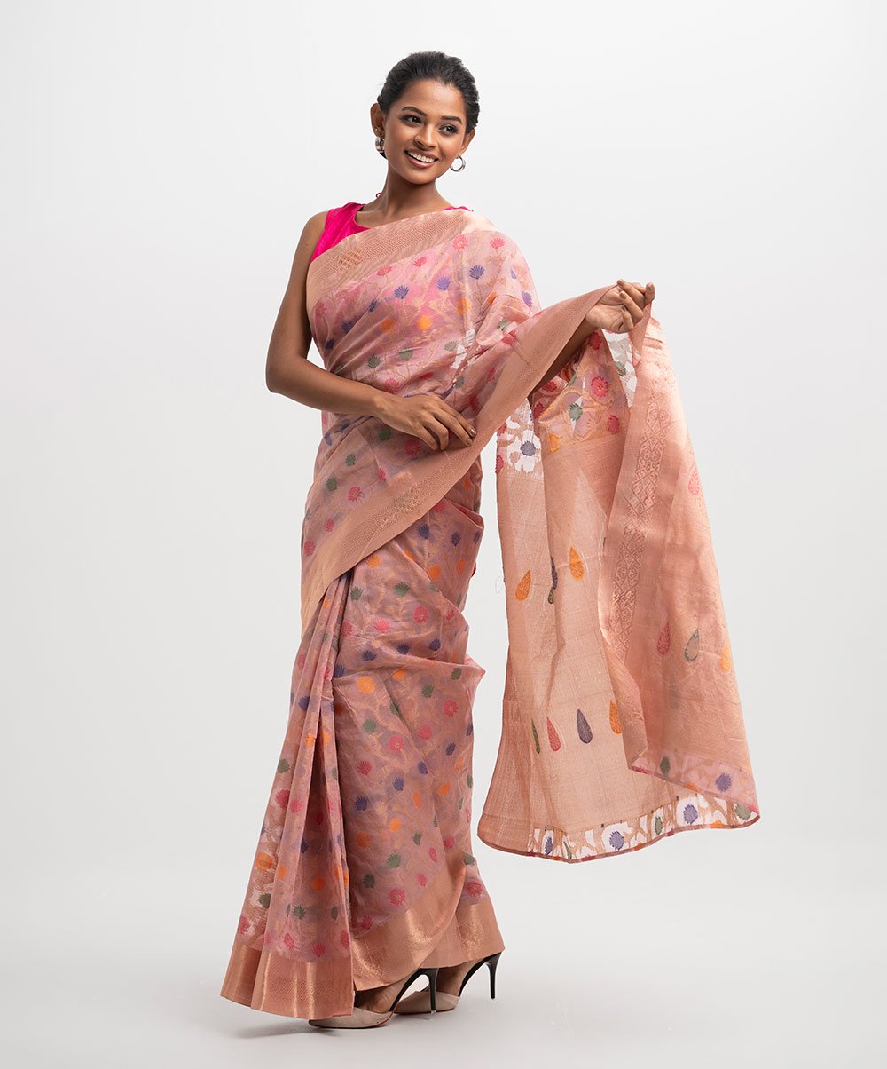 Embrace the delicate charm of a summer dawn with this stunning Peach Floral Jamdani Saree. This piece is a contemporary celebration of the ancient ‘figured muslin’ tradition, blending the lightness of fine cotton-silk with the opulence of metallic zari. The heritage of Jamdani dates back centuries to the Mughal era, where it was favored by royalty for its translucency and cooling properties in the South Asian heat. This saree features a mesmerizing array of multi-colored floral ‘butis’ or motifs, each individually hand-woven into the translucent base. The soft peach canvas is beautifully framed by a broad, copper-toned zari border that catches the light with every movement, adding a touch of metallic luster to the matte fabric. The silhouette is characterized by its airy volume and crisp drape, allowing for a voluminous flare at the hem that moves gracefully as you walk. This saree is the quintessential choice for high-tea events, daytime spring festivals, or a sophisticated Mehndi ceremony. For a fresh, modern look, style it with a vibrant fuchsia or rose-pink silk blouse to create a playful color-blocked effect. Minimalist accessories, such as a pair of oversized silver-oxidized jhumkas and a stack of delicate glass bangles, will complement the artisanal texture without overwhelming the intricate weave. We suggest a fluid, open-pallu drape to showcase the transparency of the fabric and the meticulous placement of the floral motifs, paired with dewy makeup and a soft floral hair accessory to complete this vision of ethereal South Asian luxury.