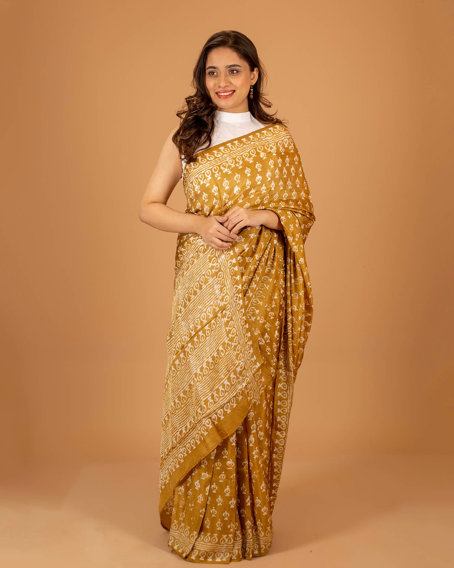 The “Provakor” saree is a sublime masterpiece of artisanal heritage, a profound testament to the timeless allure of hand-block printing that has flourished in the vibrant heart of the Indian subcontinent for centuries. Drenched in a rich, sun-kissed mustard-ochre hue, this saree celebrates the intricate influences of Rajasthan’s “Sanganeri” and “Bagru” traditions, where every motif is a narrative hand-carved into seasoned teak wood blocks. Each imprint on the fabric is the result of a rhythmic, meditative dance between the master artisan’s hand and the textile, ensuring that no two pieces are ever truly identical, imbuing the garment with a unique soul. The fabric itself is a luxurious blend of fine silk and premium cotton, offering a tactile experience that is both breathable for daytime summer weddings and sumptuously soft against the skin for cooler evening galas. The silhouette is meticulously designed to command attention; the pallu features an intricate, dense arrangement of geometric borders and traditional butas that cascade with an architectural elegance over the shoulder. When draped in the classic Nivi style, the saree falls with a majestic grace, its weight perfectly balanced to allow for effortless movement and a sweeping flare at the base. For a grand wedding or a high-spirited festive celebration, style the Provakor with heavy antique gold temple jewelry and a sleek, high-neck ivory blouse to create a striking contrast against the earthy, royal tones. A traditional jasmine gajra in the hair and a bold vermillion bindi will complete this look of regal sophistication. Whether you are traversing a palace courtyard or a modern ballroom, the Provakor ensures you carry the weight of artisanal history with the effortless lightness of contemporary luxury.
