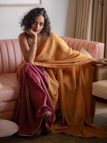 The Raag Jugalbandi Saree is a visual symphony that captures the soul-stirring depth of Indian classical melodies. This exquisite drape features a striking juxtaposition of molten ochre and regal plum, embodying the richness of traditional handloom artistry. The foundation of the saree is a premium silk-cotton weave, prized for its tactile texture and the subtle, matte luster that is characteristic of authentic Maheshwari or Chanderi traditions. The deep wine-toned pleats serve as a dramatic anchor, featuring a constellation of delicate gold-toned butis. These accents are applied using the time-honored Kamdani technique, where artisans meticulously hand-stitch metallic threads to create a textured, luminous effect that dances in the light. The palla, in a radiant shade of turmeric gold, provides a striking contrast, finished with a delicate beaded or piped border that adds a touch of refined opulence. The silhouette is designed for effortless elegance; the structured weight of the pleated section ensures a perfect ‘fall’ at the feet, while the airy palla allows for versatile draping, whether pinned neatly or left to flow over the arm. To style this for a grand occasion like a Diwali soirée or a Sangeet ceremony, pair it with antique temple jewelry in matte gold and a bold, deep-toned bindi. A high-neck brocade blouse in a matching plum or a contrasting black would elevate the ensemble’s regal appeal. Finish the look with hand-crafted mojris and a velvet potli bag. The Raag Jugalbandi is a testament to the enduring allure of South Asian craftsmanship, designed to resonate with the wearer’s own unique rhythm and timeless sophistication.