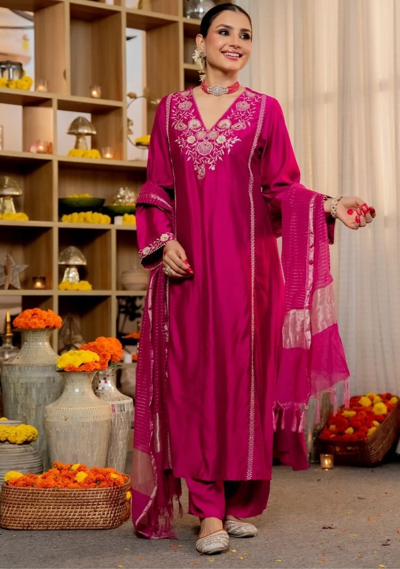 Exude the regality of a modern-day princess in our Rani Embroidered Viscose Silk Kurta Set, a garment that pays homage to the vibrant ‘Rani’ pink—a color synonymous with Indian heritage and the spirited soul of Rajasthan. This ensemble is crafted from premium viscose silk, a fabric celebrated for its liquid-like drape and subtle, sophisticated sheen that catches the light with every movement. The centerpiece of the kurta is its deep V-neckline, adorned with meticulous artisanal embroidery that draws inspiration from the floral trellises of Persian architecture. The hand-work features a delicate interplay of ivory and silver threads, creating a soft contrast against the bold fuchsia base. The silhouette is a masterclass in understated elegance, featuring a long, straight-cut kurta that offers a slenderizing effect, complemented by full sleeves with ornate cuffs that mirror the neckline’s intricate detailing. The set is paired with matching straight-fit trousers and a lightweight dupatta featuring horizontal metallic stripes and delicate tassels, adding a touch of rhythmic movement to the overall look. For a grand festive occasion like a Mehendi ceremony or a Sangeet, style this set with a statement polki choker and oversized studs. Complete the look with gold-toned mojaris and a sleek low bun adorned with fresh jasmine or marigolds to lean into the traditional aesthetic. The strategic placement of the embroidery on the neckline and sleeve hems ensures that the focus remains on the craftsmanship while maintaining a clean, contemporary aesthetic. This isn’t just an outfit; it’s a testament to the enduring allure of South Asian textiles, reimagined for the woman who values both tradition and effortless grace.