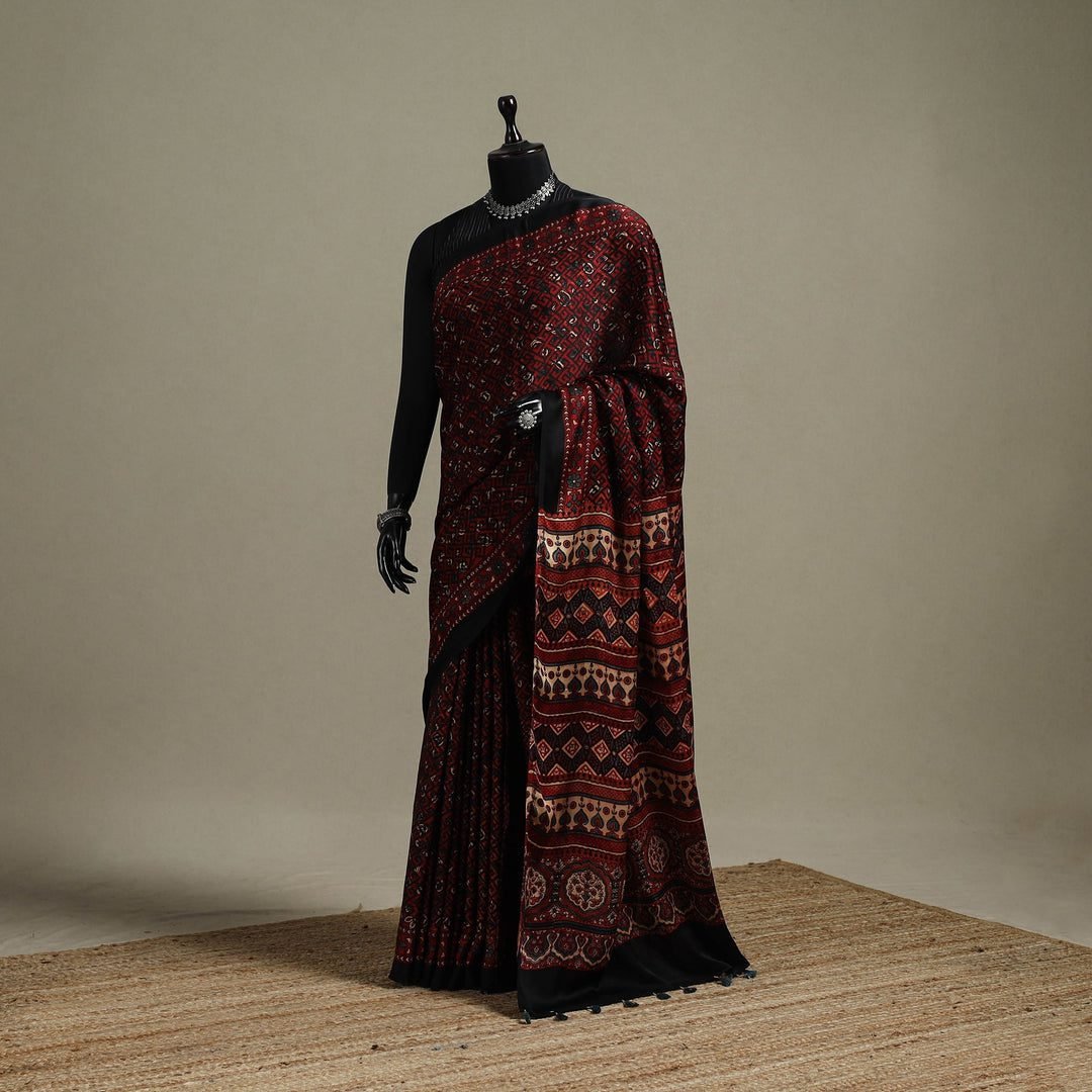 Immerse yourself in the soulful depths of Indian craftsmanship with our Red Natural Dyed Hand Block Print Modal Silk Ajrakh Saree. This piece is an ode to the ‘Al-Zarak’ tradition, focusing on the grounding, earthy tones of madder red—a color that signifies fertility and celebration in South Asian culture. The heritage of Ajrakh is one of patience and precision; each wooden block is hand-carved and stamped with mathematical accuracy to create the ‘jaal’ patterns that have remained unchanged for centuries. Crafted from premium Modal Silk, the texture is exceptionally soft, possessing a subtle lustrous finish that catches the light beautifully during evening festivities. This fabric is prized for its high tensile strength and its ability to hold the intricate details of natural dyes without fading.