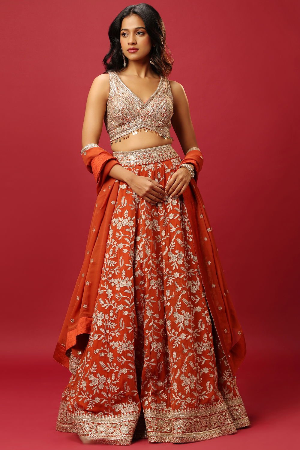 Radiate regal warmth in this rust orange lehenga set. Intricately adorned with gold zari floral motifs, the voluminous flare captures traditional craftsmanship. The plunging V-neck blouse is finished with delicate metallic tassels, while a soft dupatta completes the silhouette. Perfect for a grand festive celebration or a destination wedding.