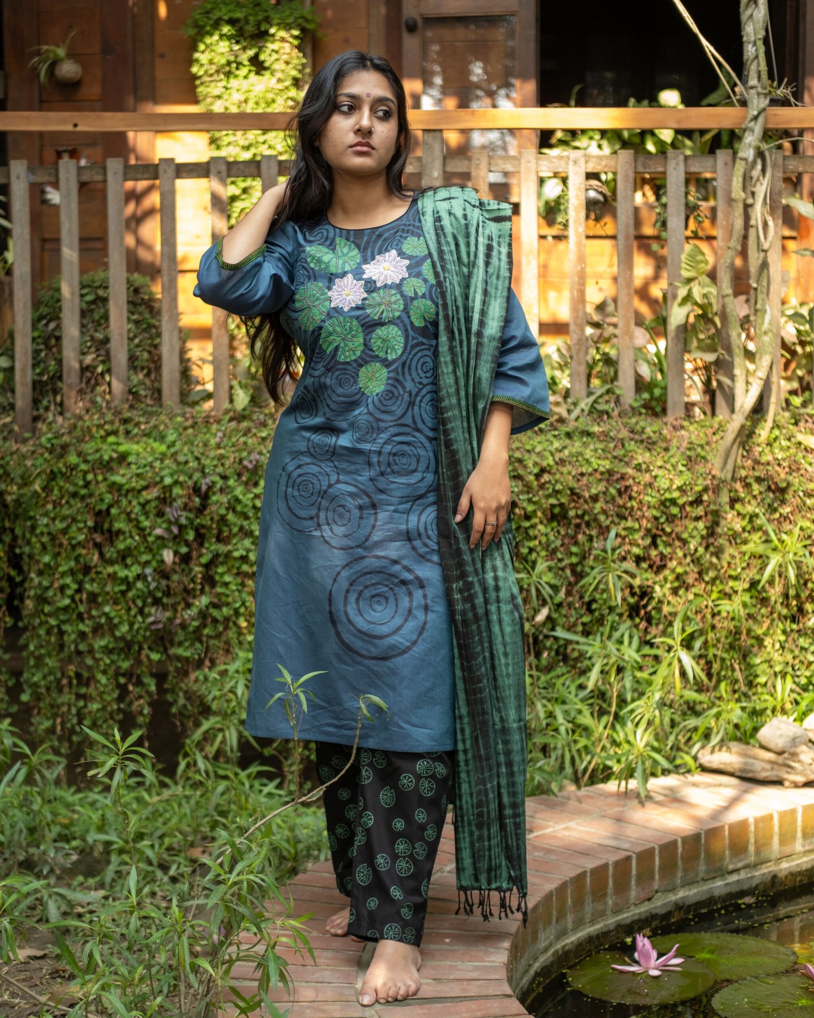 Evoke the serene majesty of a monsoon morning with the ‘Shapla Jheel’ Salwar Kameez, a masterpiece that pays homage to the ‘Shapla’—the ethereal water lily that reigns over the tranquil ponds of Bengal. This ensemble is a poetic rendition of South Asian heritage, utilizing the ancient art of wax-resist Batik and hand-block printing. The base fabric is a premium, breathable cotton-silk blend, offering a lustrous sheen that mimics the surface of a sun-drenched lake. The deep teal kameez is adorned with rhythmic, hand-painted concentric circles representing the gentle ripples of water, while the chest features exquisite hand-embroidered lotuses. These floral motifs are brought to life using the ‘Sujni’ stitch, where every petal is meticulously layered to create a three-dimensional effect. The silhouette is a classic straight-cut kameez with three-quarter sleeves, finished with a delicate contrast border. It is paired with jet-black trousers featuring intricate green leaf motifs, providing a grounded contrast to the fluid upper. The crowning glory is the hand-dyed dupatta, showcasing a sophisticated Shibori technique in shades of forest green and charcoal. For a grand festive occasion, style this ensemble with heirloom silver jhumkas, a stack of glass bangles, and embellished mojaris. The deep jewel tones make it an exceptional choice for an evening soirée or a traditional wedding ceremony, where the blend of artisanal craftsmanship and modern elegance will surely command the room. This is not merely an outfit; it is a wearable canvas that celebrates the enduring bond between nature and the skilled Karigars of the subcontinent, ensuring you carry a piece of history with every step.
