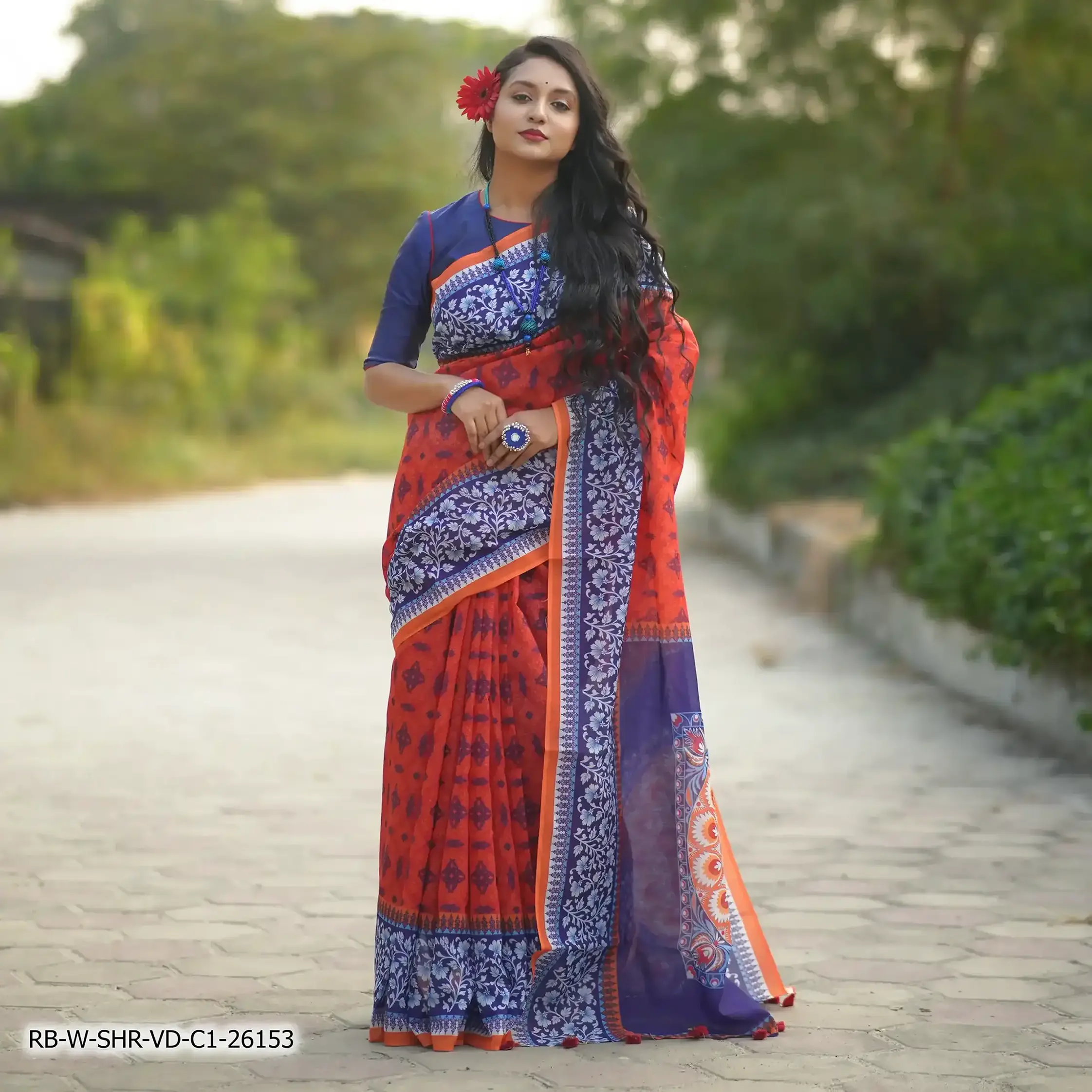 A vibrant celebration of heritage and color, this Red and Indigo Handloom Saree is a masterpiece of traditional block-printing techniques. Drawing inspiration from the centuries-old ‘Ajrakh’ and ‘Tant’ traditions of Bengal and Western India, this saree tells a story of earth, fire, and water through its rich palette. The primary body is a sunset orange-red, adorned with rhythmic geometric ‘Buttas’ that represent the harmony of nature. Woven from the finest long-staple cotton, the fabric offers unparalleled breathability and a soft, tactile finish that becomes even more supple with every wear. The true grandeur lies in the contrasting deep indigo border and pallu, which are decorated with ‘Kalka’ (paisley) and floral motifs in a striking ivory discharge print. The pallu is further elevated with delicate hand-tied tassels that add a playful movement to the silhouette. For a festive gathering such as Pohela Boishakh, Diwali, or a cultural gala, pair this saree with a solid navy blue blouse to pull the colors together. Enhance the look with a bold red bindi, fresh jasmine in your hair, and traditional terracotta or blue pottery jewelry. The silhouette is exceptionally flattering, offering a soft flare at the bottom that allows for ease of movement. The lightweight nature of the weave ensures that the saree drapes snugly around the waist, highlighting the wearer’s grace without adding bulk. It is a quintessential choice for the connoisseur of ethnic textiles who seeks a balance between bold aesthetics and artisanal depth.