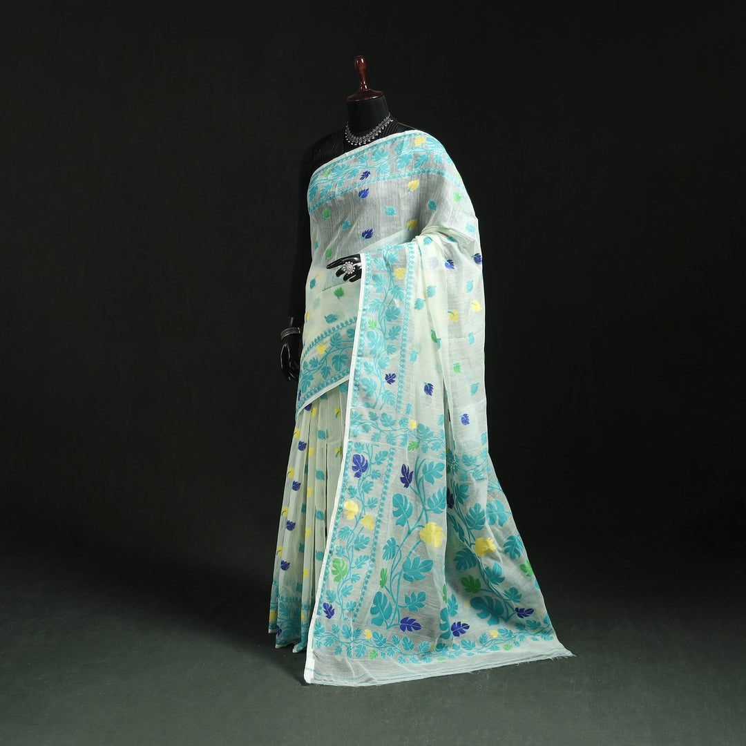 Embrace the celestial charm of the Silk Cotton Dhakai Jamdani Saree 18, a garment that embodies the pinnacle of South Asian textile artistry. Originating from the historic looms of Bengal, the Jamdani craft was once the exclusive preserve of Mughal royalty, celebrated for its ‘Panna Hazar’ (thousand emeralds) and floral ‘Butidar’ patterns. This saree features a pristine cream base, providing a luminous backdrop for the striking turquoise and royal blue motifs that define its character. The fabric is a delicate silk-cotton blend, offering a translucent, gossamer-like texture that feels weightless against the skin while maintaining a regal structure. Every motif is hand-woven directly into the loom using an extra weft of thread, creating a pattern that appears to float on the surface of the fabric—a hallmark of the authentic Dhakai technique. The design features a densely patterned border and an exquisite pallu adorned with intricate leaf-like scrolls and geometric fusions in shades of seafoam and azure. The silhouette is designed for grace; when draped, the saree flows effortlessly, with the vibrant borders framing the figure with architectural precision. For a daytime summer wedding or a festive luncheon, pair this ethereal piece with contemporary gold jewelry or turquoise-encrusted statement earrings. Opt for a dewy makeup look and a classic ‘seedha pallu’ or ‘Nivi’ drape to showcase the intricate hand-work of the borders. This saree is not merely an outfit; it is a wearable piece of history, reflecting a legacy of craftsmanship that has been passed down through generations of master weavers, making it a prized addition to any luxury trousseau.