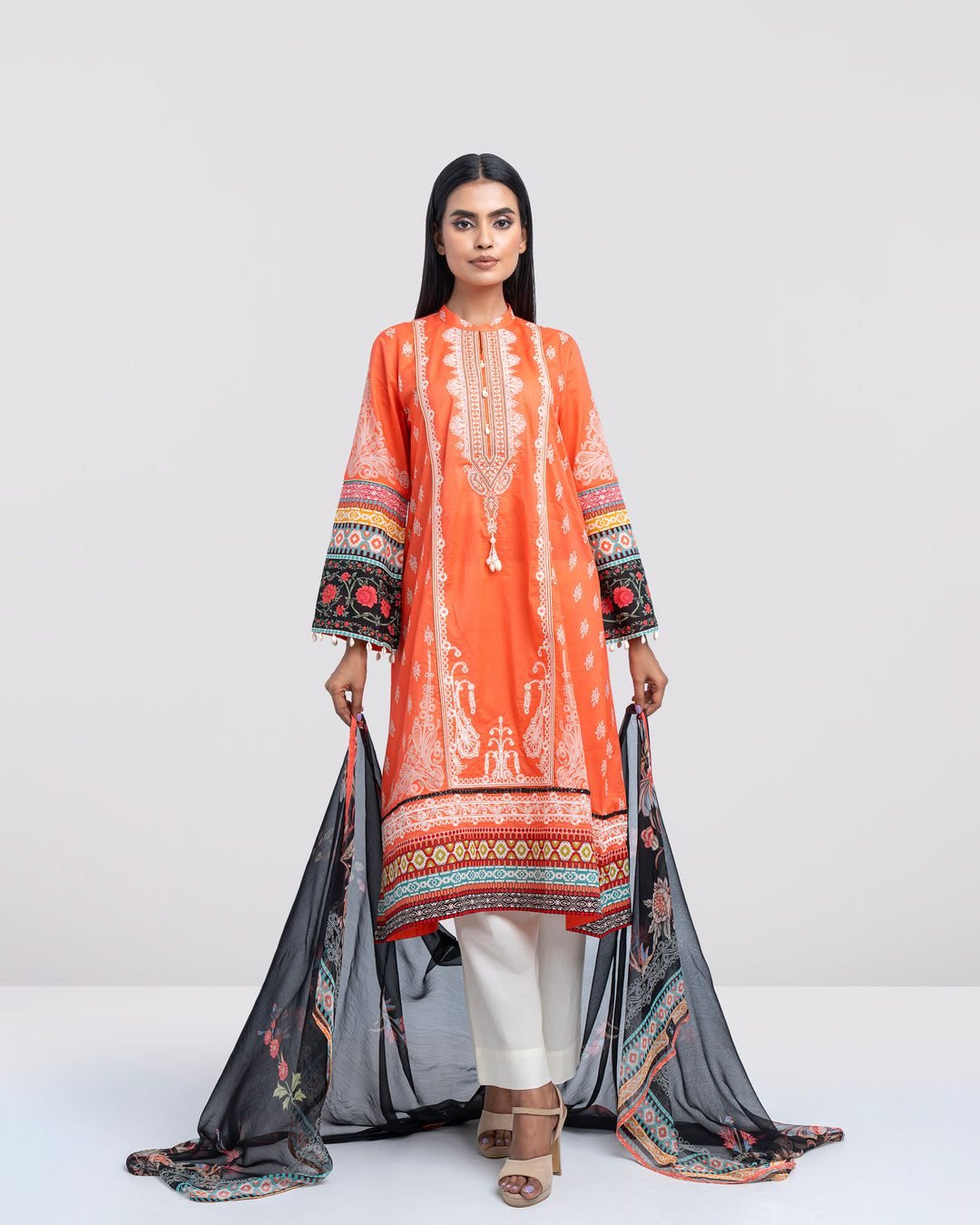 Embodying the vibrant energy of a South Asian sunset, this Smart Fit Digital Printed Lawn ensemble is a masterpiece of color theory and traditional craftsmanship. The base, a striking shade of tangerine, pays tribute to the ‘Basant’ festivals and the celebratory spirit of the Punjab region. This ensemble is meticulously crafted from high-grade, long-staple cotton Lawn, a fabric that has been the cornerstone of luxury summer wear in the East for centuries. What sets this piece apart is the ‘Smart Fit’ silhouette—a tailored, contemporary cut that nips slightly at the waist before flowing into a structured hemline, offering a more defined shape than the traditional straight kameez. The print is a sophisticated blend of Persian-inspired ‘Buta’ motifs and sharp, monochromatic geometric patterns along the sleeves and hem, creating a visual balance between the organic and the architectural. A standout feature is the inclusion of a gossamer-light chiffon dupatta in deep charcoal black, adorned with a mirror-image floral border. Chiffon, historically associated with the elite for its difficult weaving process and ethereal transparency, adds a layer of formal sophistication to the outfit. The sleeves are further elevated with artisanal tassel detailing, a playful nod to the ‘Gota’ and ‘Latkan’ work found in bridal couture. For a high-profile wedding event or a festive dinner, drape the dupatta over one shoulder to showcase the intricate sleeve art. Pair it with gold ‘Jhumkas,’ a sleek middle-parted hairstyle, and nude stilettos to allow the fiery orange and contrasting black to command the room’s attention.