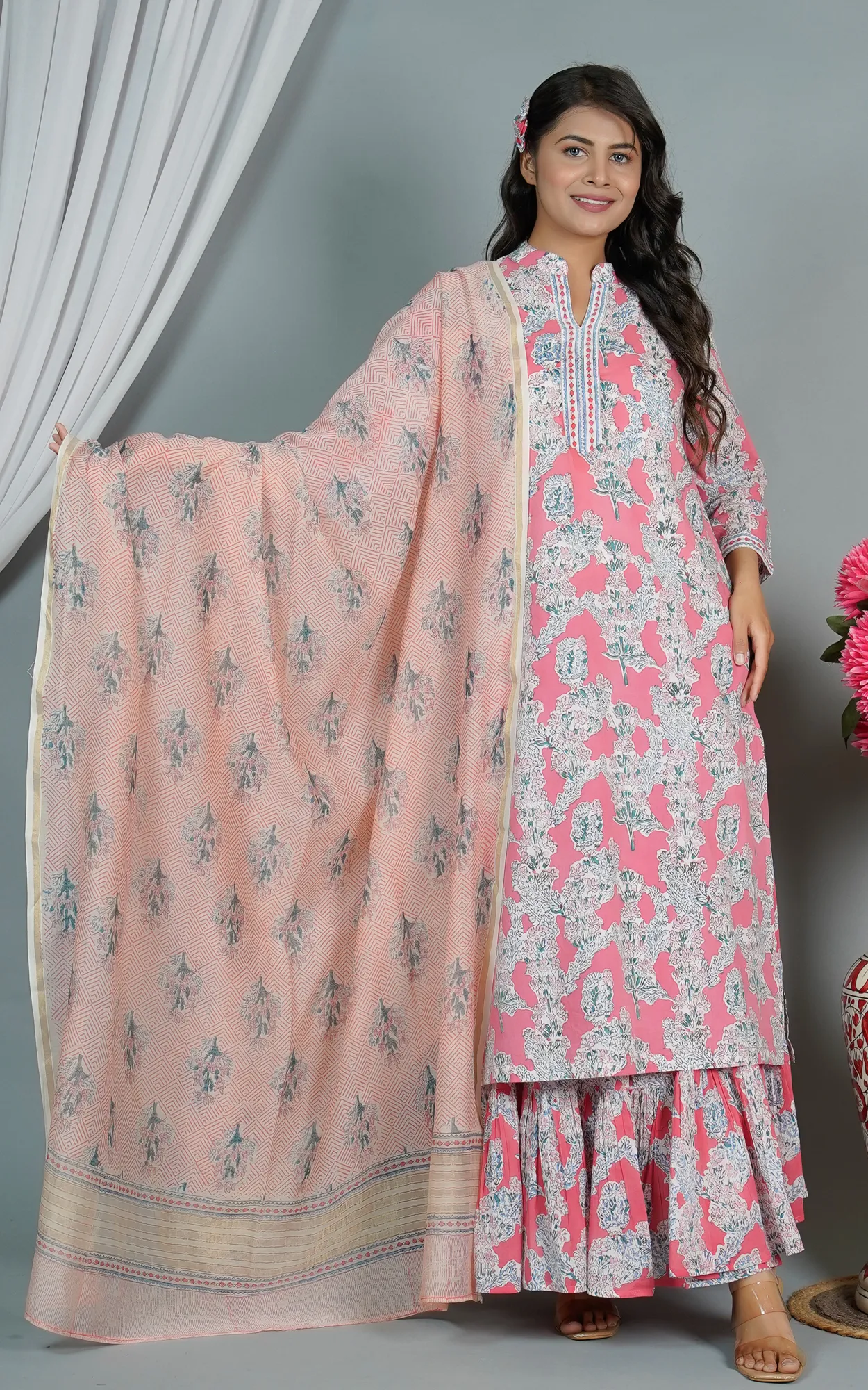 Discover the vibrant allure of this rose-pink Maheshwari stole, where traditional geometric patterns meet contemporary floral artistry. The high-quality weave provides a crisp yet supple handle, perfect for structured drapes. Framed by classic zari borders, it adds a regal touch to your silhouette, embodying Madhya Pradesh’s rich textile legacy.