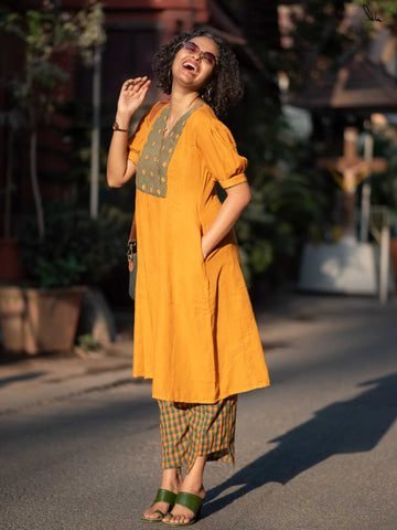 Evoking the radiant spirit of the Indian summer, the ‘Sunshine Genda’ Kurta Set is a masterful celebration of the marigold—a flower deeply woven into the fabric of South Asian rituals and celebrations. This ensemble pays homage to the heritage of hand-spun textiles, utilizing a premium handloom cotton that breathes with the wearer, offering a tactile experience that is both grounded and luxurious. The silhouette is a sophisticated take on the traditional A-line kurta, featuring a generous flare that dances with every step. The centerpiece of the garment is a beautifully contrasted olive-green V-neck yoke, adorned with delicate hand-block printed motifs reminiscent of the ancient Sanganeri craft, where artisans use hand-carved wooden blocks to create rhythmic patterns. The sleeves are a modern marvel, designed with a gentle puff and cinched cuffs to add a touch of romanticism to the structured bodice. Practicality meets poise with the inclusion of discreet side pockets, a nod to the contemporary woman’s needs. The ensemble is completed by a pair of cropped, checkered trousers in a harmonious palette of forest green and turmeric orange, creating a visual texture that breaks the monotony of the solid mustard hue. For a high-spirited Haldi ceremony or a festive outdoor brunch, style this set with oversized oxidized silver jhumkas and hand-crafted leather Kolhapuris. A messy low bun and a swipe of kohl will enhance the artisanal charm of this outfit, making it a quintessential choice for the connoisseur of understated elegance.