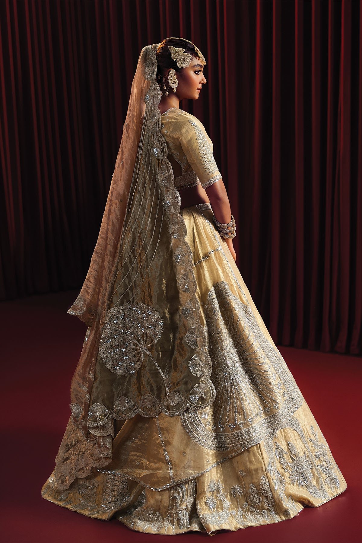 Evoking the ethereal glow of a full moon reflecting upon the marble palaces of Rajasthan, The ‘Chandni’ Lehenga is a masterpiece of celestial elegance and regal sophistication. This ensemble is meticulously crafted from premium tissue silk, a fabric celebrated for its luminous sheen and structured drape, which provides the perfect canvas for its breathtaking metallic ornamentation. The heritage of this piece lies in the age-old Zardosi and Gota Patti techniques, crafts that flourished under the patronage of the Mughal emperors. Skilled artisans have spent hundreds of hours hand-weaving silver metallic threads and sequins into intricate sunburst and floral motifs that radiate across the voluminous flare of the lehenga. The silhouette is designed to command attention, featuring a high-waisted, structured skirt that flows into a grand, sweeping circumference. The accompanying choli is adorned with dense embroidery on the sleeves and neckline, mirroring the architectural precision of ancient jali work. Perhaps the most striking element is the diaphanous dupatta, which features a unique scalloped border and oversized fan-shaped embroidery, creating a sense of movement and grace. For a grand wedding reception or a Sangeet ceremony, style this lehenga with a heavy silver choker, matching ‘Passa’ or ‘Maang Tikka’, and stacked bangles to lean into the ‘Old World’ royalty aesthetic. The ‘Chandni’ is not merely an outfit; it is a luminous heirloom designed for the modern woman who cherishes the weight of tradition and the sparkle of contemporary luxury. The interplay of light on the golden-silver fabric ensures that you remain the cynosure of all eyes, glowing with a radiance that is truly timeless.