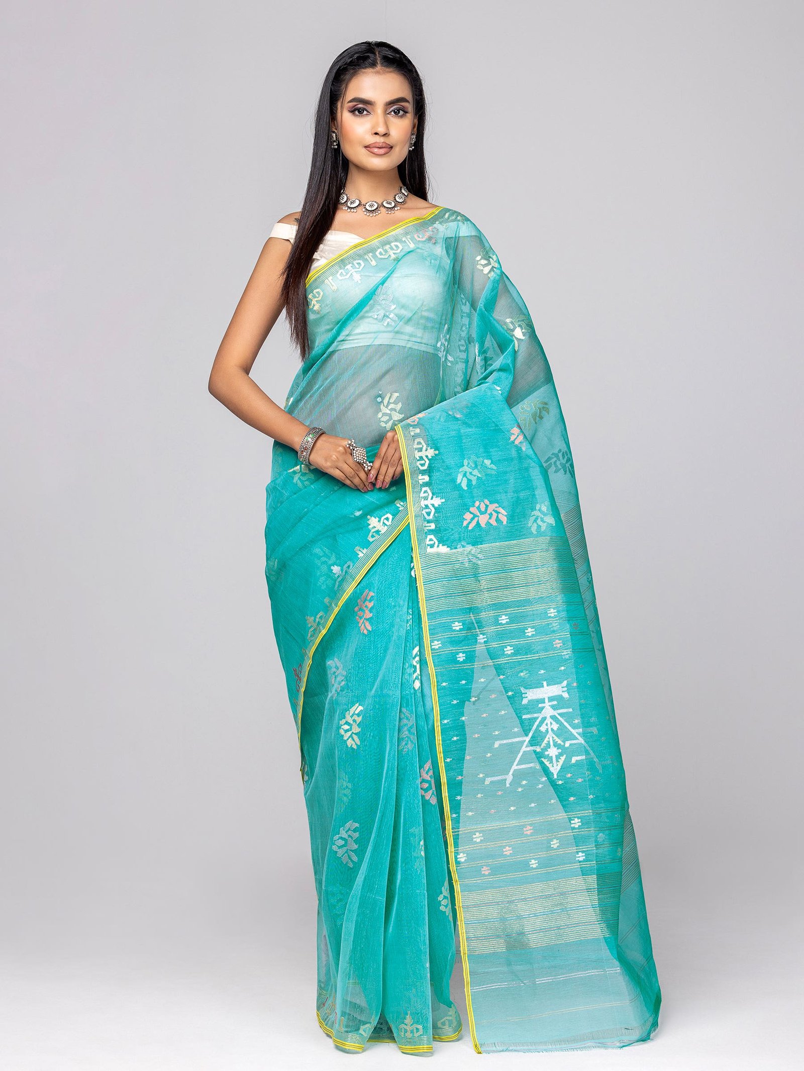 Step into a realm of unparalleled luminescence with our Turquoise Half Silk Jamdani Saree, an exquisite tribute to the UNESCO-recognized craft of Jamdani weaving. Originating from the historic looms of Dhaka, Jamdani is often referred to as ‘woven air’ due to its sheer, diaphanous quality and the labor-intensive ‘discontinuous supplementary weft’ technique. In this process, every geometric motif is inlaid by hand using individual needles while the fabric is still on the loom, making each piece a unique work of textile art. The fabric is a luxurious blend of fine silk and premium cotton, offering the opulent sheen of silk with the structural crispness of cotton. The vibrant turquoise hue serves as a striking backdrop for the silver and white ‘butis’ (motifs) that dance across the body, culminating in a magnificent pallu featuring large-scale geometric totems. A subtle, sunshine-yellow piping runs along the selvedge, providing a contemporary pop of color that defines the silhouette. The drape is exceptionally light and airy, allowing for a voluminous flare at the base while remaining sleek and fitted through the waist. For a grand wedding reception or a high-octane festive gala, we recommend pairing this saree with a modern off-shoulder silk blouse as pictured, or a deep-neck velvet bodice for a play on textures. Accessorize with a polki diamond choker and sleek, straight hair to balance the traditional craftsmanship with a high-fashion edge. This saree is a celebration of heritage, designed to make you the cynosure of every eye under the evening lights.