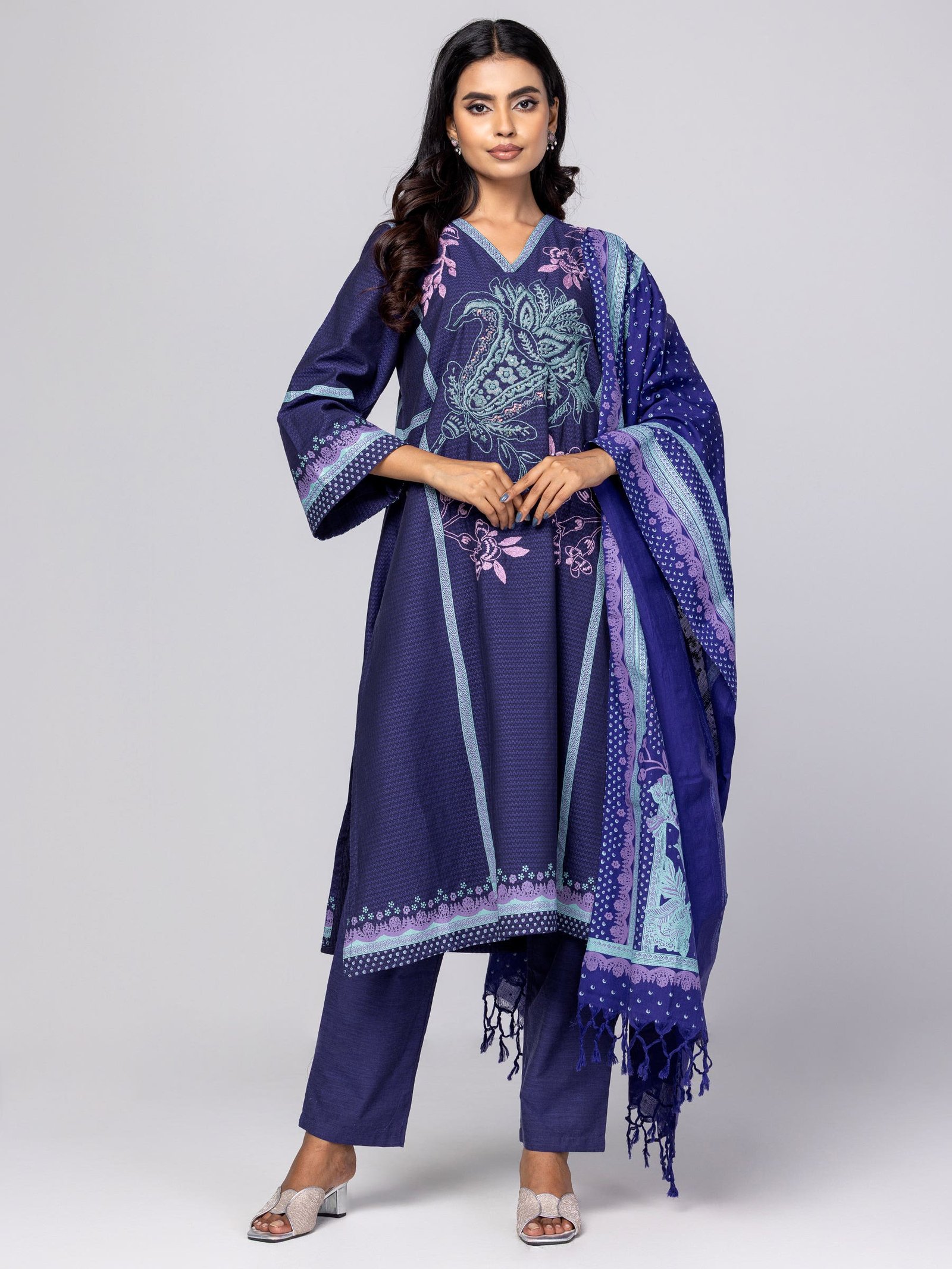 Step into a realm of regal sophistication with our Violet Ornamenta Theme Shalwar Kameez, a masterpiece that pays homage to the timeless artistry of the Indian subcontinent. The deep, royal violet hue serves as a canvas for the ‘Boteh’ or paisley motif, a symbol of life and eternity that dates back to the Sassanid Dynasty and was later perfected by Kashmiri weavers under Mughal patronage. This ensemble features a meticulously crafted central medallion on the kameez, where intricate line-work mimics the precision of traditional woodblock printing. The fabric is a premium, high-density cotton-silk blend, offering a subtle sheen and a crisp texture that holds its form beautifully throughout long celebrations. The silhouette is designed for modern grace, featuring a structured V-neckline and slightly flared sleeves that allow for ease of movement. The hemline is adorned with a geometric border that draws the eye downward, leading to perfectly tailored, slim-fit trousers. The accompanying dupatta is a work of art in itself, featuring a gradient of blues and violets with delicate tassels that add a rhythmic movement to your gait. For a grand wedding or a festive Eid gathering, style this ensemble with heirloom silver jhumkas and a sleek, low bun. The architectural lines of the print require little ornamentation, making it the perfect choice for the woman who values heritage with a contemporary edge. Complete the look with silver embellished mojaris or block heels to elevate the silhouette, ensuring you command the room with an aura of understated luxury and historical depth.