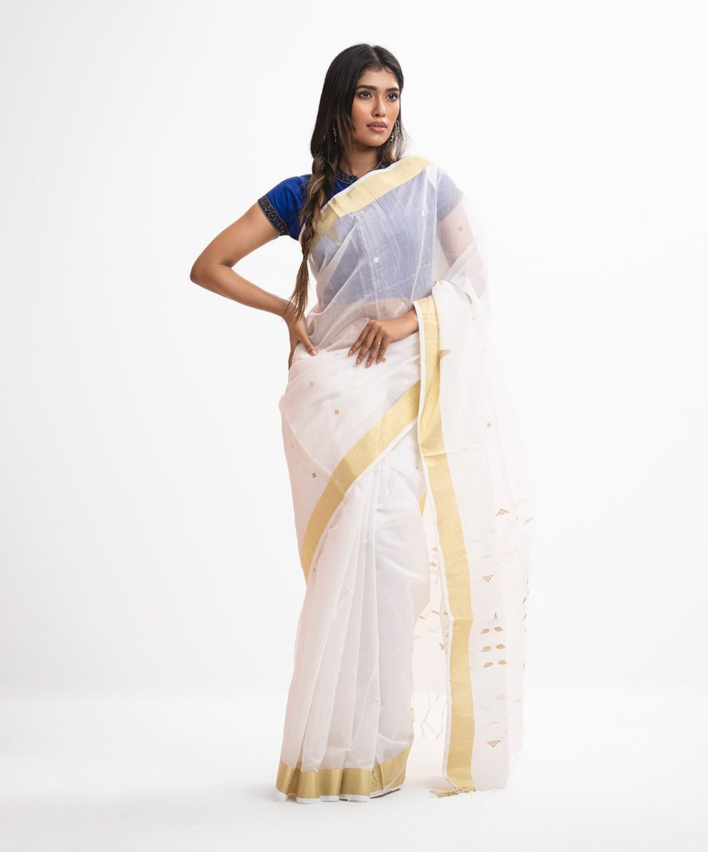 Embody the ethereal grace of a moonlit garden with our Ivory Gold Half-Silk Saree, a sublime homage to the heritage of South Asian textiles where simplicity meets the opulence of royalty. The half-silk weave is a celebrated innovation, combining the shimmering sheen of mulberry silk with the matte, textured feel of hand-spun cotton, creating a fabric that is both regal and remarkably lightweight. This specific style draws inspiration from the legendary weaving traditions of Chanderi and Bengal, known for their sheer, cloud-like weight and luminous presence. The saree is adorned with delicate ‘butis’—small, scattered geometric motifs—woven with precision using fine golden Zari threads that catch the light with every step. The most striking feature is the wide, lustrous gold border that frames the translucent white fabric, creating a halo of radiance around the wearer. The artisanal hand-work is evident in the subtle, rhythmic variations of the weave, ensuring a unique texture that feels like a second skin. This saree is designed for fluid movement; the lightweight fabric allows for a graceful ‘Nivi’ drape or a classic ‘Seedha Pallu’ style. The sheer quality of the half-silk creates a beautiful play of light and shadow, while the structured gold border provides enough weight for the pleats to fall with a statuesque flare. For a high-profile wedding or a grand festival like Diwali, style this saree with a contrasting royal blue velvet blouse to make the white pop. Accessorize with traditional Polki diamonds or heavy gold Jhumkas, and opt for a side-swept braid to enhance the ethereal, timeless aesthetic of this regal drape.
