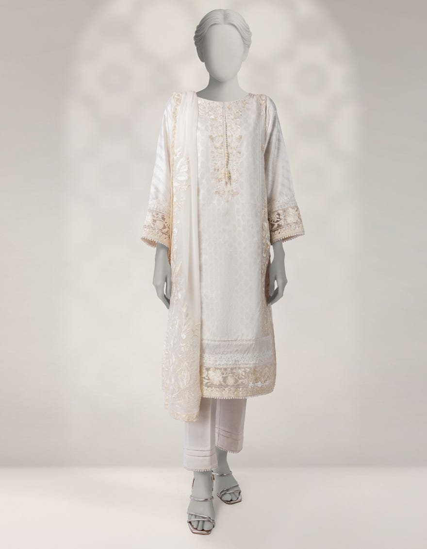 White Jacquard Embroidered 3pc Stitched