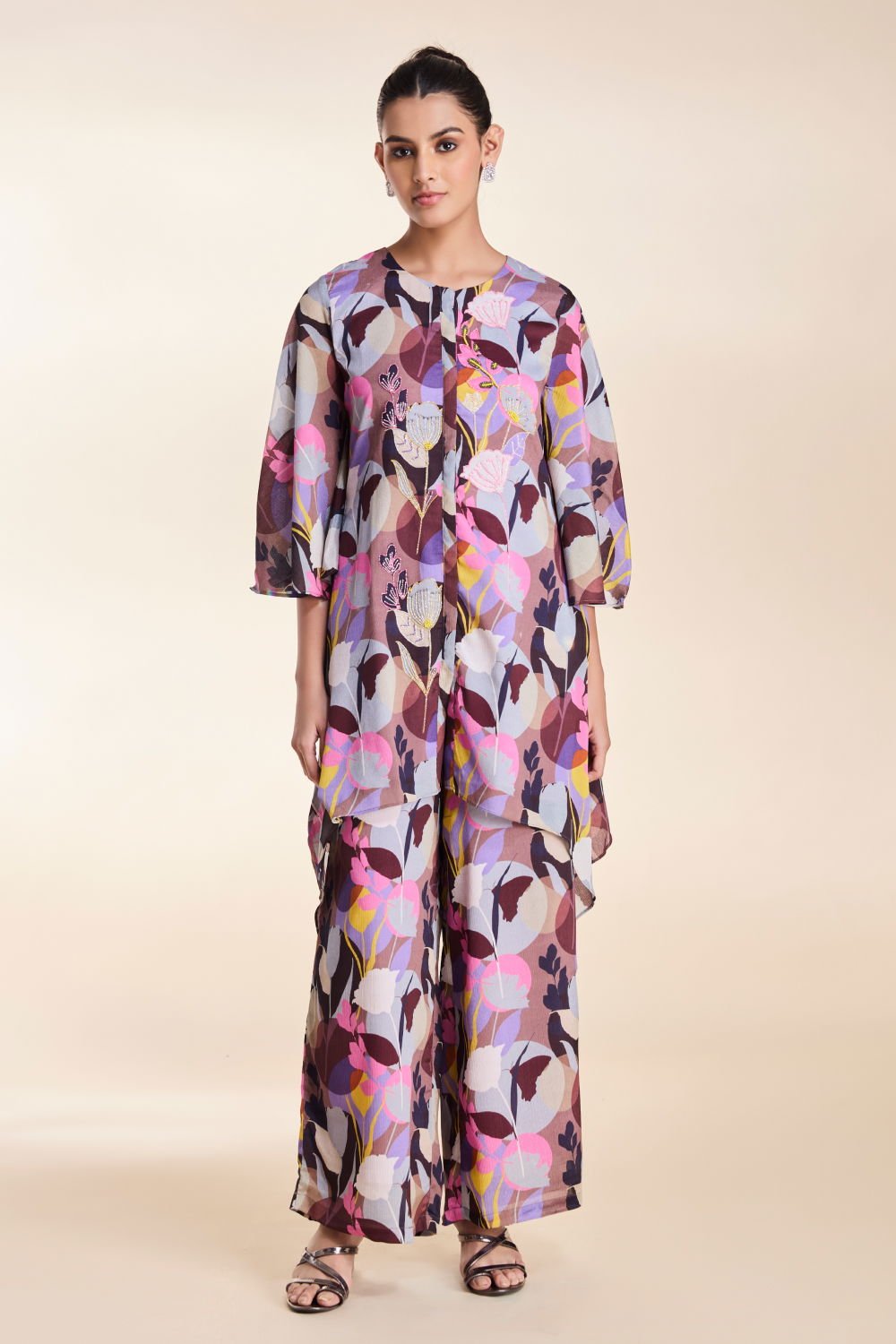 A masterclass in modern South Asian style, this wine maroon printed set features a fluid, asymmetrical tunic paired with voluminous wide-leg trousers. The rich, multi-colored palette is adorned with abstract floral motifs and subtle hand-embroidery. This ensemble offers a bold yet elegant silhouette, perfect for making a sophisticated statement.
