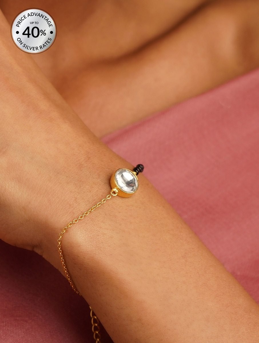 Embrace the celestial glow of the Mughal courts with our Women’s Kundan 925 Sterling Silver Bracelet, a masterpiece that bridges the gap between ancestral heritage and contemporary elegance. The art of Kundan, or ‘refined gold,’ is one of India’s oldest jewelry crafts, flourishing under the patronage of the Great Mughals before finding its spiritual home in the royal ateliers of Rajasthan. This bracelet features a magnificent, hand-set Kundan stone at its heart, encased in a bezel of hallmarked 925 sterling silver that has been meticulously bathed in a rich gold vermeil. Unlike modern machine-cut crystals, each Kundan stone is hand-selected for its unique clarity and depth, reflecting a soft, moonlight-like radiance that is synonymous with traditional ‘Jadau’ work. The silhouette is defined by a slender, high-polish gold chain that tapers elegantly around the wrist, accented by a singular black bead—a subtle nod to the ‘Nazariya’ tradition, believed to ward off the evil eye while maintaining a sophisticated aesthetic. For a grand wedding celebration, style this piece as part of a curated wrist stack alongside a heavy kangan or a set of glass bangles. It pairs exquisitely with the intricate metallic threads of a Zardosi-embroidered lehenga or the sheer, ethereal drape of a hand-woven Organza saree. The minimalist flare of the central setting ensures it does not snag on delicate fabrics, making it an ideal companion for high-octane festivities. Whether you are attending a vibrant Mehendi ceremony or an intimate Nikkah, this bracelet serves as a testament to the enduring legacy of South Asian craftsmanship, offering a timeless allure that transcends seasons.