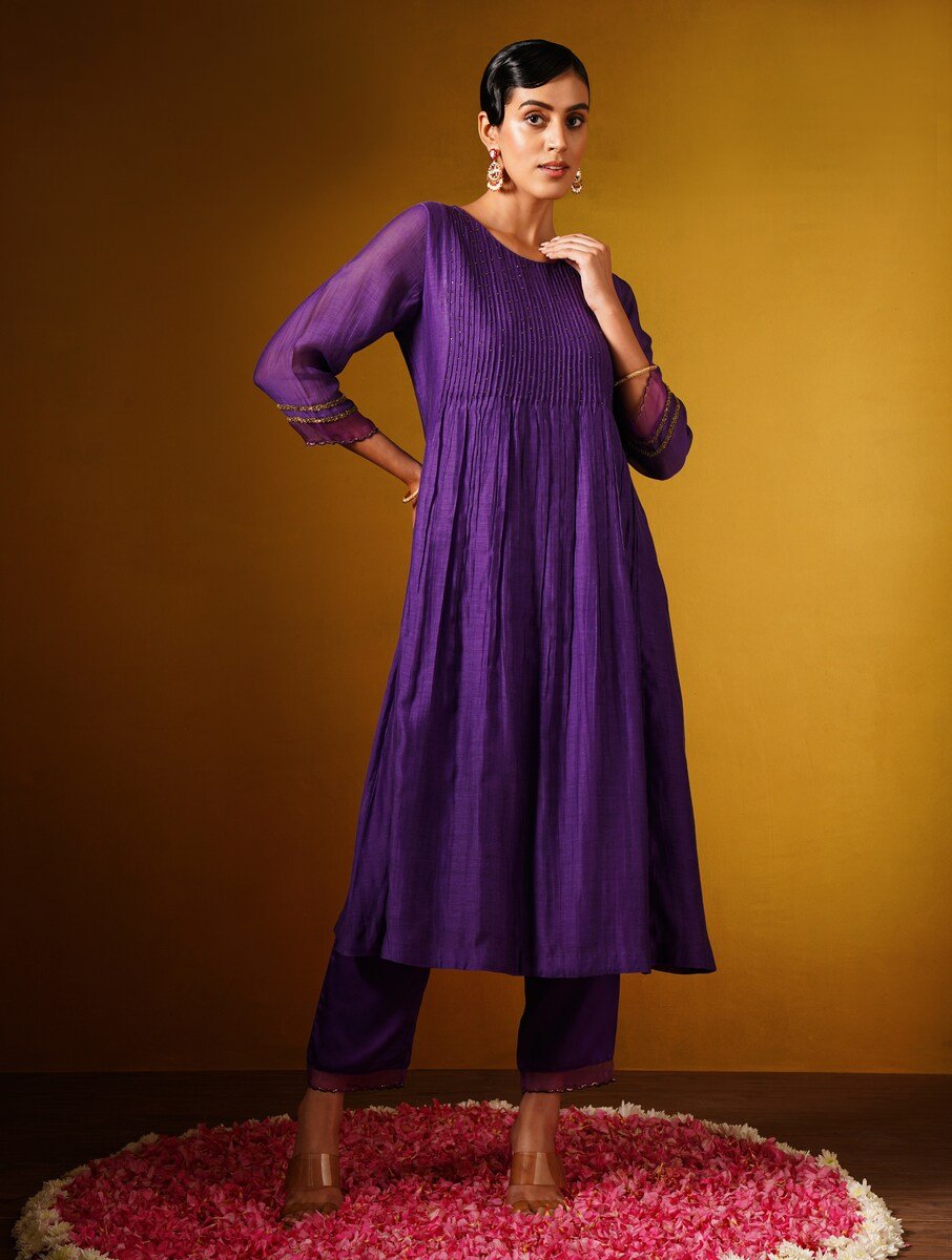 Envelop yourself in the royal hues of this purple cotton silk kurta set. The bodice features delicate hand-stitched pleats and subtle embroidery, flowing into a graceful, flared silhouette. Sheer sleeve accents with gold detailing add an ethereal touch, while the coordinating pants complete this sophisticated, artisanal look.