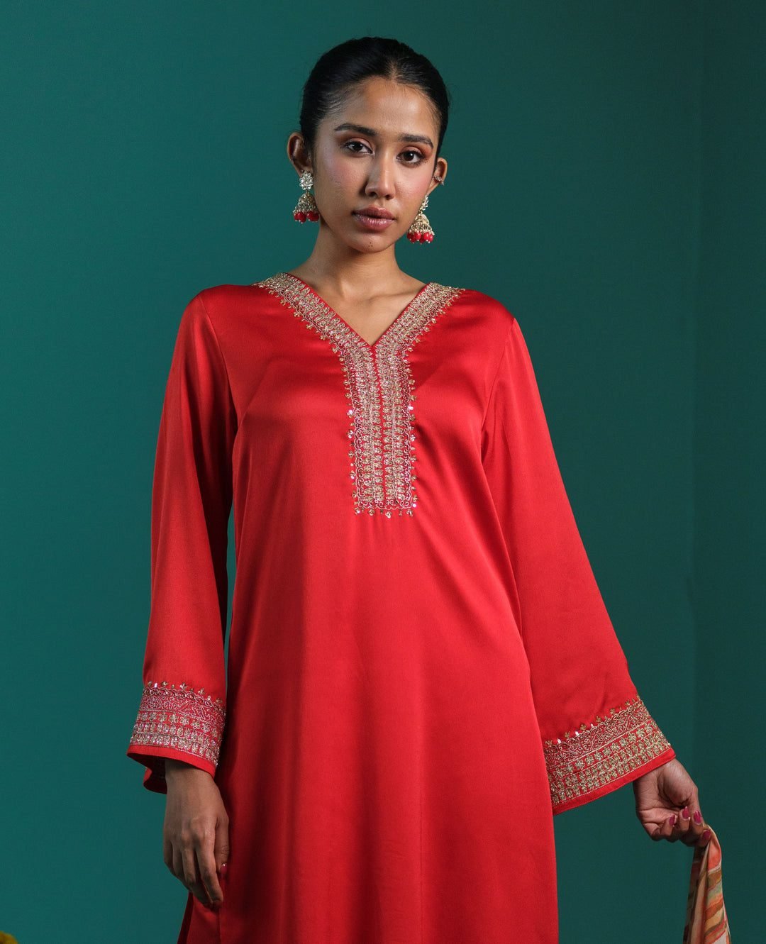 Envelop yourself in the regal splendor of our Crimson Heritage 3-Piece Suit, a masterpiece that pays homage to the opulence of the Mughal courts. This ensemble is meticulously crafted from the finest heavy-weight silk satin, offering a liquid-gold sheen that captures the light with every movement. The centerpiece of this garment is the intricate V-neckline, adorned with traditional Zardosi and Marori hand-embroidery. This ancient craft, which reached its zenith under royal patronage, involves the use of metallic threads and delicate sequins to create a tapestry of light against the deep red canvas. The embroidery is mirrored on the flared sleeve cuffs, ensuring that your gestures are framed in gold. The silhouette is a classic straight-cut long kurta, designed to offer a lengthening effect that exudes poise and authority. For a grand wedding reception or a festive Diwali gala, style this set with oversized antique gold Jhumkas featuring ruby drops to match the rich hue. Complement the look with a sheer gold tissue dupatta draped elegantly over one shoulder and traditional mojaris. The structured shoulders and fluid drape of the silk ensure you remain the focal point of any room. This is not just a suit; it is a legacy of South Asian craftsmanship, blending the boldness of the modern woman with the timeless grace of the past. The vibrant red symbolizes prosperity and joy, making it the ultimate choice for the season’s most anticipated celebrations, ensuring you embody the spirit of heritage while maintaining a contemporary, high-fashion edge.