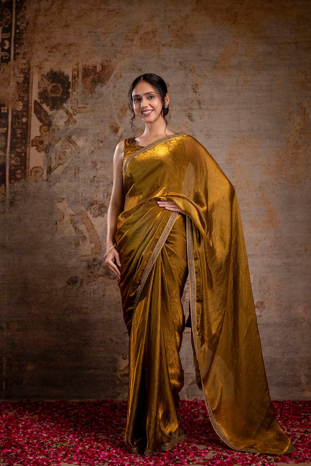 Capture the essence of liquid sunshine in this golden silk blend saree. Boasting a luminous sheen and a rich textured weave, the saree drapes with effortless opulence. Finished with a slender, hand-embellished border, this radiant ensemble is designed for the modern woman who seeks a bold yet classic silhouette.