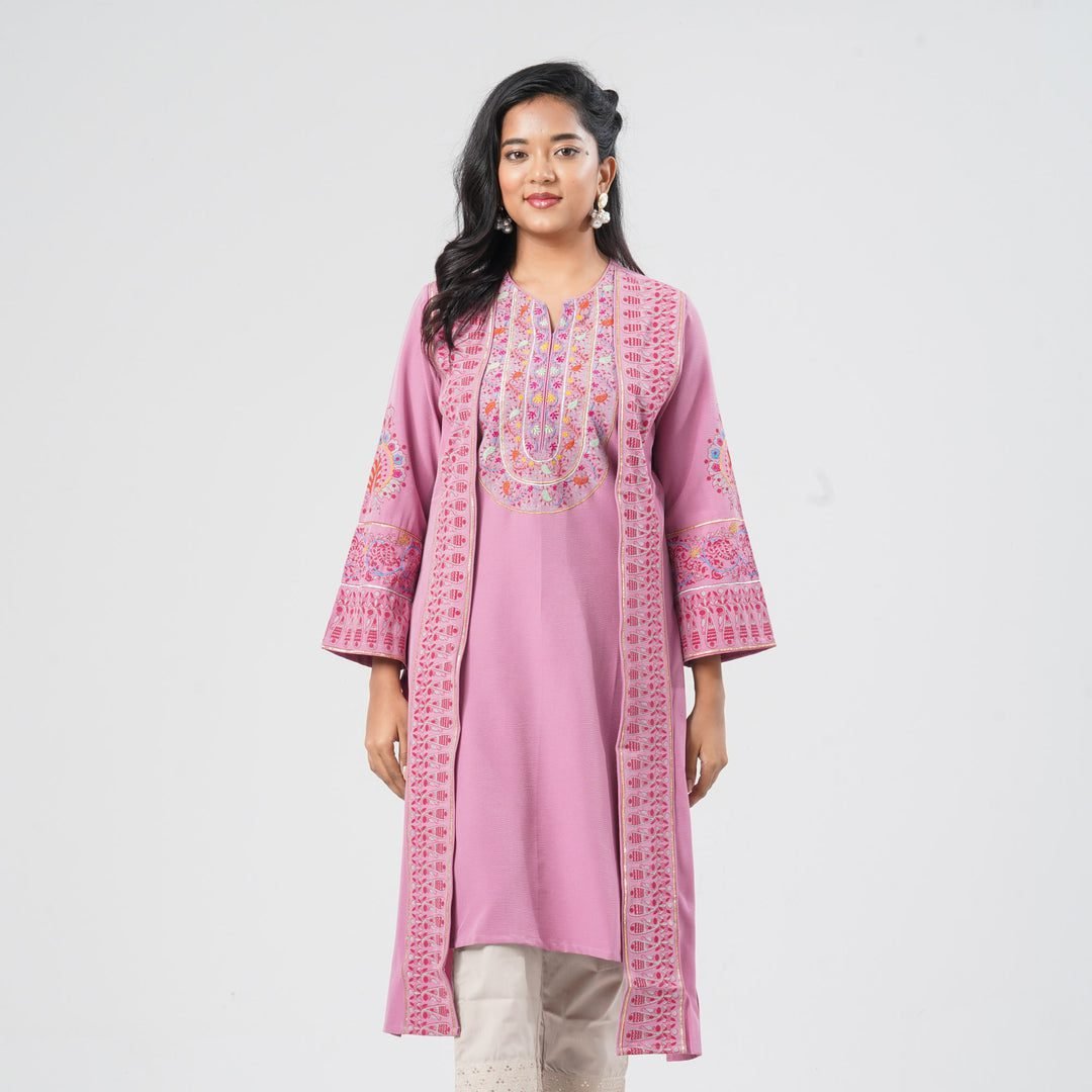 Step into a realm of ethereal beauty with our Women’s Layered Kurti, a garment that celebrates the poetic layering techniques favored by the artisans of the Mughal era. Rendered in a sophisticated shade of dusty lavender, this ensemble speaks to a refined sensibility and a deep appreciation for South Asian textile history. The kurti is constructed with a dual-layer aesthetic, featuring a translucent outer shell that creates a sense of depth and mystery, a technique often seen in the ‘Peshwas’ of royal courts. The focal point of this piece is the exquisite hand-embroidery that frames the U-shaped neckline and cascades down the front panels. Drawing inspiration from the floral bounty of the Kashmir valley, the ‘Aari’ needlework utilizes multi-colored silk threads to create a tapestry of intricate vines and blossoms. Each stitch is a testament to the hours of labor provided by master craftsmen, ensuring that no two pieces are exactly alike. The borders and the wide, flowing bell sleeves are finished with a detailed geometric pattern, adding a structured contrast to the organic floral motifs. The silhouette is designed with a gentle A-line flare, providing an elongated and slimming effect. For a high-profile festive occasion like Eid or a Mehendi ceremony, style this kurti with ivory-toned tapered pants and statement pearl-drop earrings. A sheer organza dupatta draped over one shoulder and a pair of champagne-colored kitten heels will elevate the look, ensuring you remain the cynosure of all eyes. This kurti is not merely an outfit; it is a wearable piece of history, designed for the woman who values the soul behind the stitch.