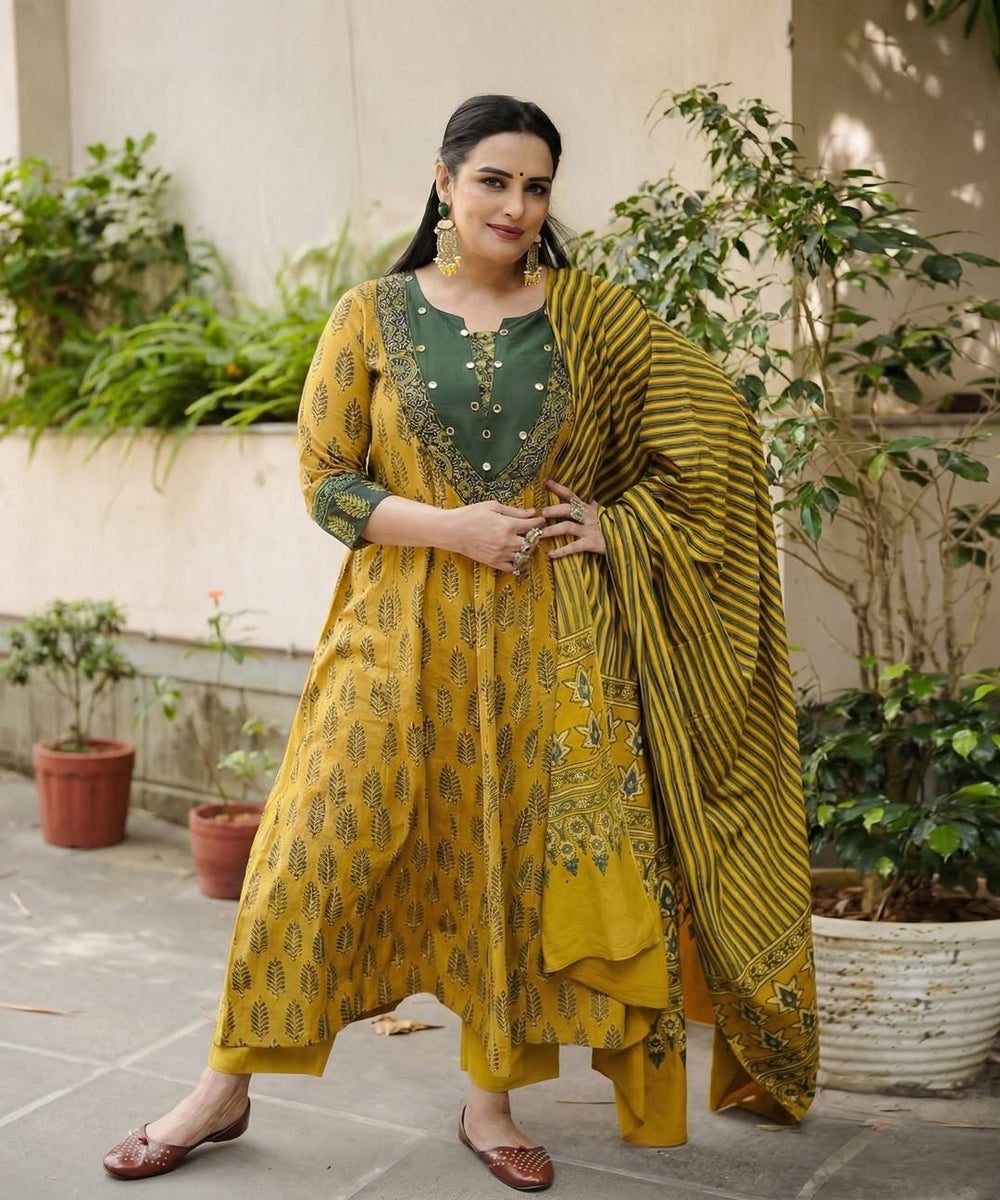 Bathed in the golden hues of a desert sunset, our Yellow Ajrakh Leaf Printed Anarkali is a vibrant celebration of artisanal resilience and South Asian heritage. This ensemble utilizes the traditional Ajrakh technique, where the bright ochre color is painstakingly derived from pomegranate peels and turmeric, ensuring a sustainable and skin-friendly luxury. The garment features a repetitive leaf motif that symbolizes growth and nature, a core theme in traditional block printing. The silhouette is designed for movement, featuring a gathered waist that erupts into a generous flare, paired with matching straight-fit trousers for a contemporary twist on the traditional suit. The standout feature is the contrasting forest green yoke, which is meticulously decorated with ‘Abhla Bharat’ or mirror work. These hand-stitched mirrors are framed by delicate thread-work, catching the light with every gesture and adding a festive sparkle to the earthy cotton texture. The ensemble is elevated by a striped dupatta featuring bold Ajrakh borders, providing a geometric contrast to the organic flow of the Anarkali. For a daytime Haldi or a vibrant Mehndi function, this outfit is best paired with oxidized silver jewelry and oversized chandbalis. The breathable fabric makes it ideal for long celebrations, while the intricate embroidery ensures you remain the center of attention. Style your hair in soft, loose waves and carry a handcrafted potli bag to complete this quintessential ethnic look that bridges the gap between ancient craft and modern festive fashion.
