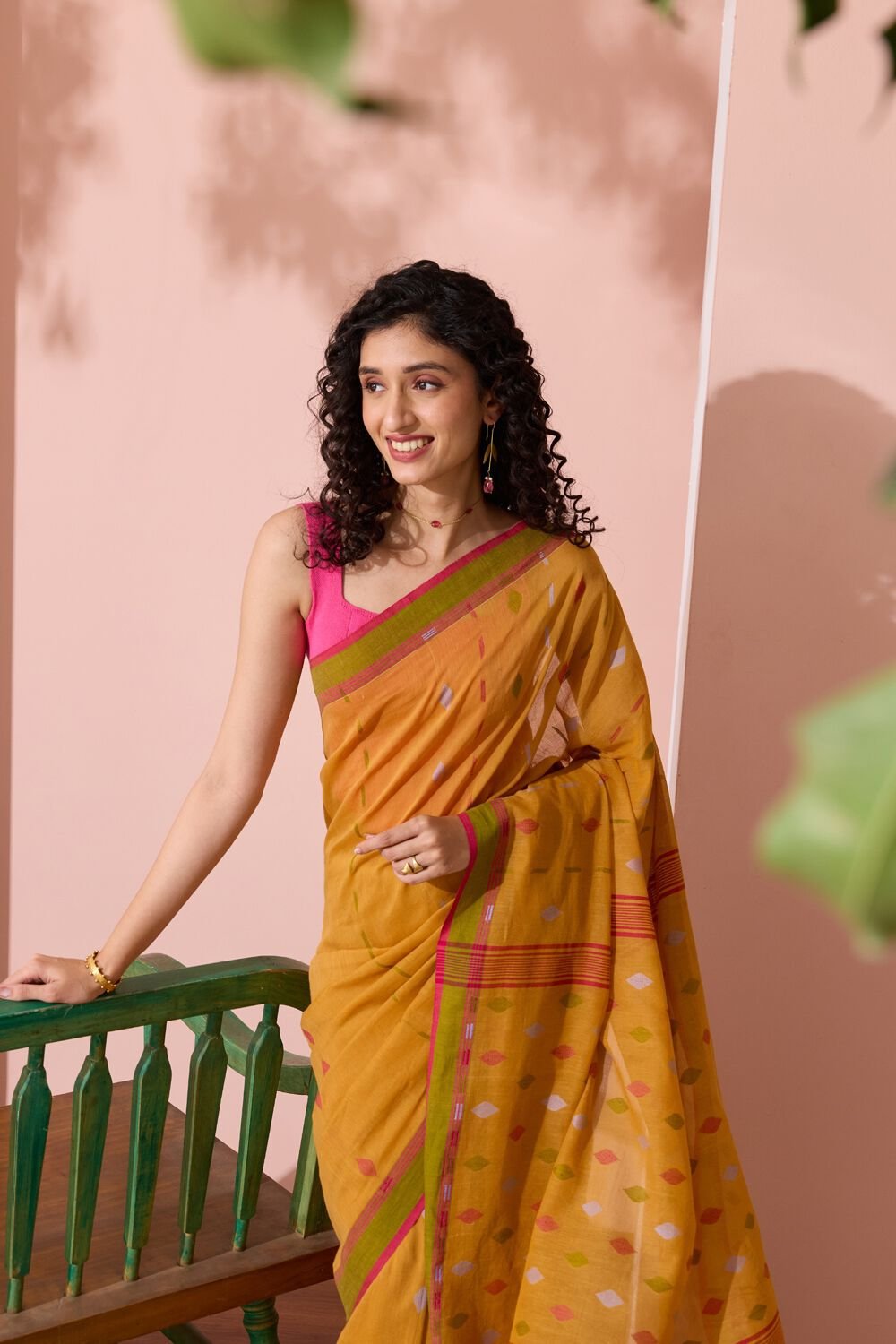Embrace the timeless elegance of the East with our Yellow Woven Pure Cotton Bengal Saree, a masterpiece that pays homage to the rich textile heritage of West Bengal. For centuries, the weavers of Bengal have been celebrated for their ability to transform humble cotton into ethereal drapes, and this saree is a testament to that enduring craft. Known historically for the ‘Tant’ weaving style, these sarees are characterized by their lightness and breathability, making them an essential for the discerning South Asian wardrobe. The fabric itself is a marvel of tactile sensation—crisp yet remarkably soft, it offers a structured drape that holds its pleats with regal precision. The vibrant mustard-yellow body is adorned with meticulously woven geometric ‘buttis’ in contrasting shades of lavender and peach, creating a rhythmic visual texture that captures the eye. The border, or ‘par’, is a sophisticated play of olive green and fuchsia pink, framed by traditional stripes that lead into a beautifully finished pallu. For a grand festive occasion like a Haldi ceremony or a Basant Panchami puja, style this saree with a sleeveless contrast blouse in hot pink to highlight the border’s vibrancy. Accessorize with antique gold jhumkas and a stack of glass bangles to lean into the vintage charm. Whether you are attending a daytime wedding brunch or a cultural festival, the silhouette’s airy nature ensures you remain the epitome of grace and comfort. The saree drapes fluidly over the shoulder, allowing the intricate woven details to catch the sunlight, ensuring you stand out as a connoisseur of authentic Indian handloom and artisanal excellence.